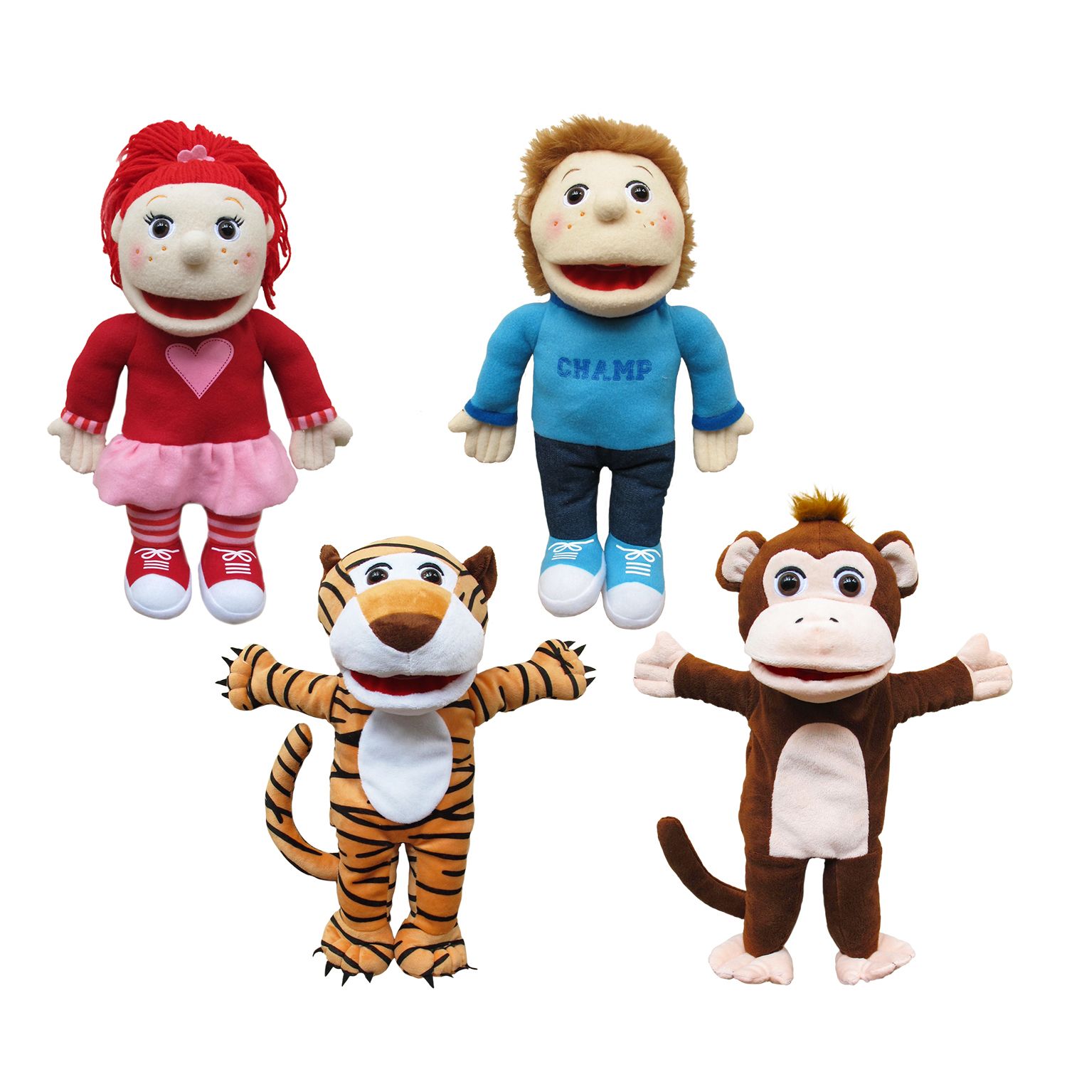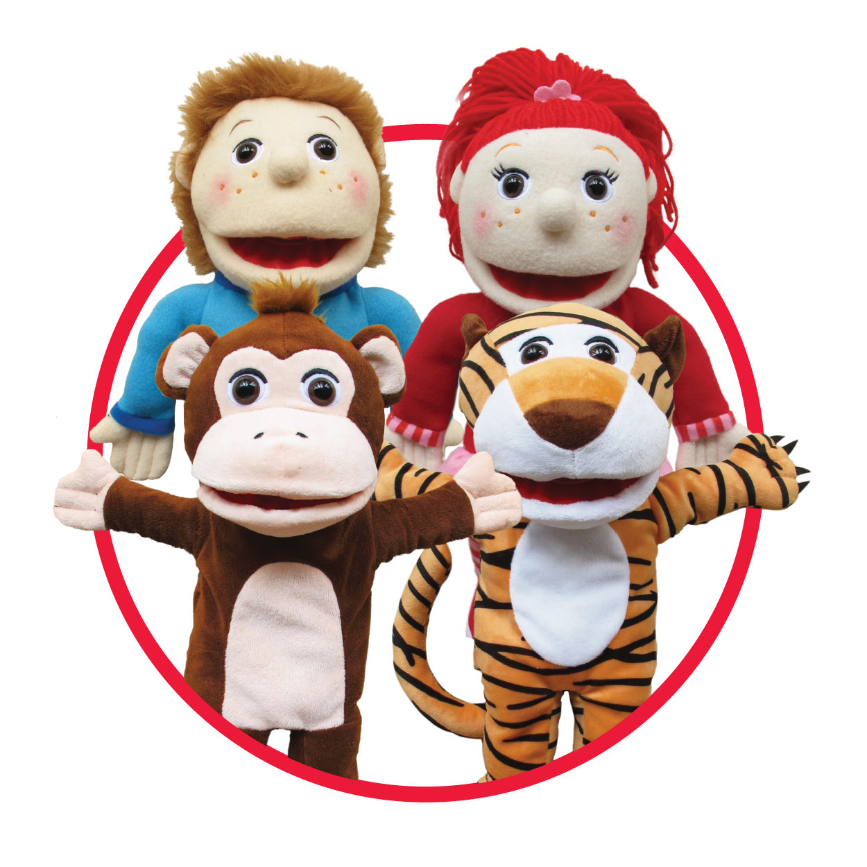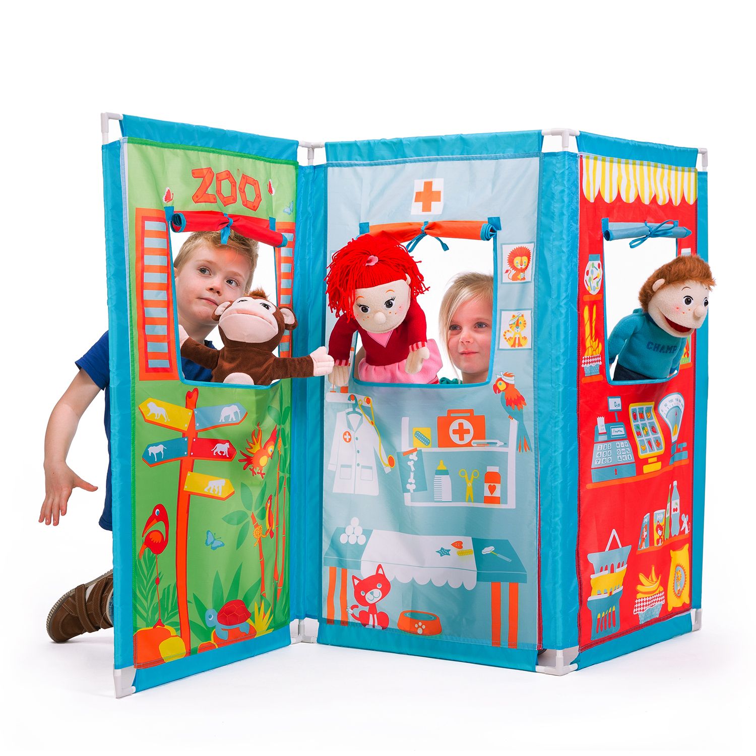 With the 4 large hand puppets and the Pop-it-Up play tent Zig Zag theater, playing puppet theater is a real party. Go on an adventure with monkey, tiger and the boy and girl and experience exciting adventures. The puppet show consists of a triptych with 3 different scenes to play: in the zoo, at the doctor and in the store.