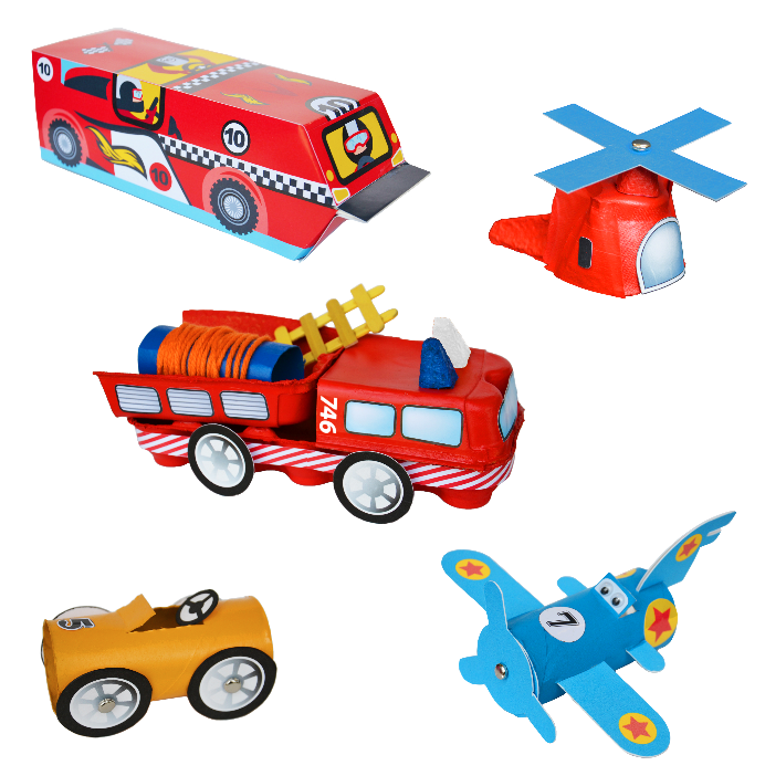 With this cars & planes themed Re-Cycle-Me box, your little one can have hours of creative fun! The box contains different materials to create a firetruck, helicopter, plane, car and a race car.